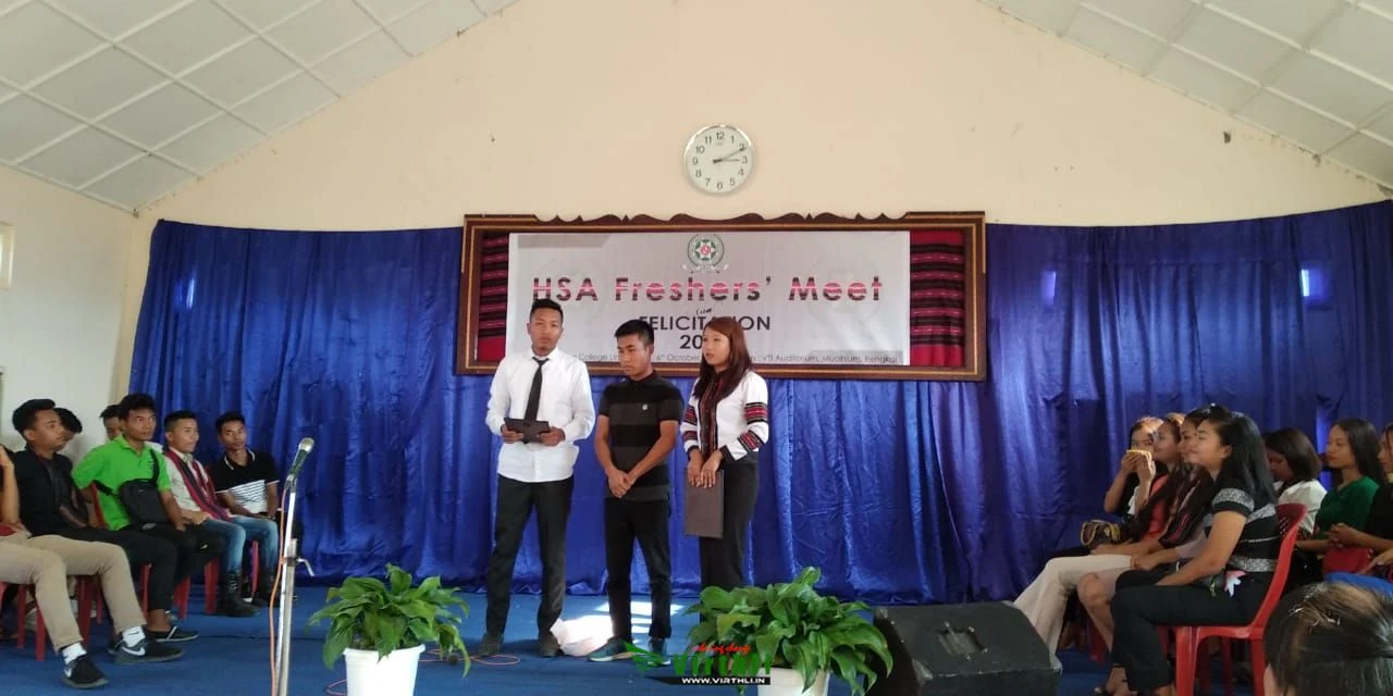 CCPur, October 06, 2018, Virthli (ONP): HSA CCPur College chun vawisun, October 6, 2018 khan VTI Auditorium, Muolhlum, Rengkai-ah Freshers' Meet-cum- Felicitation Programme an hmang. Hi huna hin Chief Guest in Solomon L. Fimate, Jr. MCS, SDC Saikot Sub-Division a thang a, Guest of Honour le Functional President in Nathan Sanate, Central Executive Member, HSA GHQ le Lilypar Zote, HOD, Happy Heart Kindergarten an thang a. Chief Host in George F. Tuollai, Public Relations, HSA GHQ a thang.