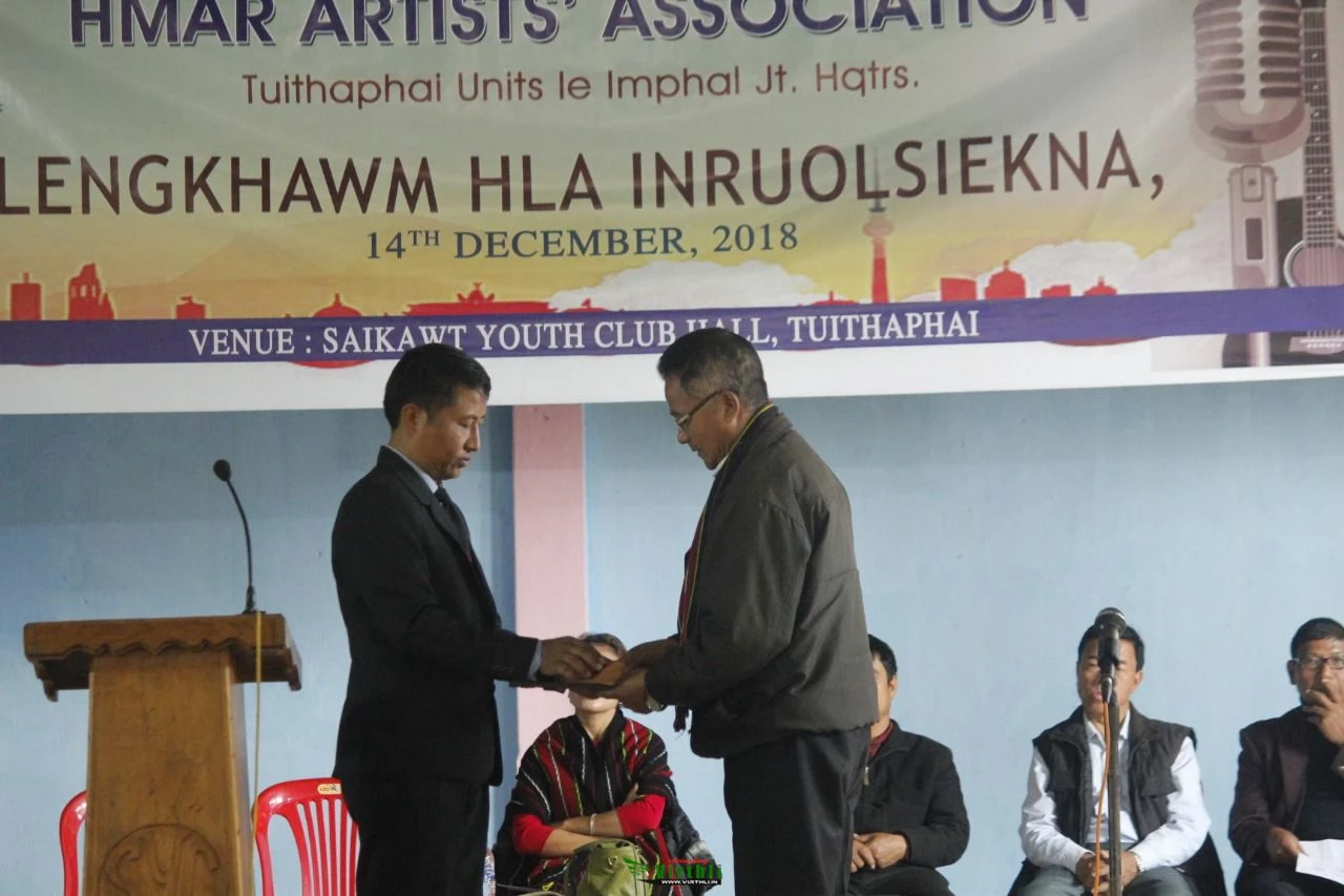 Hi huna hin “Hmar Artists’ Pa- (L) James Songrolal Songate” hrietzingna le inzana suklangnain toá¹awka sunna hunser hmang a ni a, Pu Lalvullien Hmar, President, HAA GHQ in chawimawina hunser a hmang. Hi huna hin Hmar hnam sunga organization tum tum a á¹huoituhai khawma uop vein, thuhrilna hun an hmang tawl. Hi inruolsiekna a hin HAA Unit tum tum- Rengkai Unit, Muolvaiphei Unit, Thenmuol Unit, Thingchom Unit, Saidan Unit le HPC(D) Unit an á¹hang a. Inruolsiekna result chu hieng ang hi a nih: 1st Prize- Saidan Unit (Rs. 20,000), 2nd – Rengkai Unit (Rs. 10,000), 3rd- Muolvaiphei Unit (Rs. 7000). Hi inruolsiekna a á¹hang hai po Consolation prize Rs. 1500 seng pek an ni a. Hi huna hin HAA Unit thar- HPC (D) HAA Unit hai Rs. 5000 inhlan an ni bawk. Hi inruolsiekna a endiktuhai chu- Rev. H.P. Runremthang, Rev. Lalhmingthang Famhoite, Rev. C. Lalthlunglien , Rev. John Lalnunmawi, Laltlanmawia, Pu Lalsuong Famhoite, Pu P.C Lalrawngbawla le Pi Vanlalhriet an nih.
