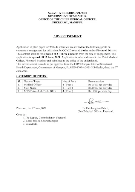 The contract shall be for a period of 3 ( Three ) months from the date of engagement. The application is opened till 12 June, 2021. Application is to be addressed to the Chief Medical Officer, Pherzawl, Manipur and submitted to the office of the undersigned.